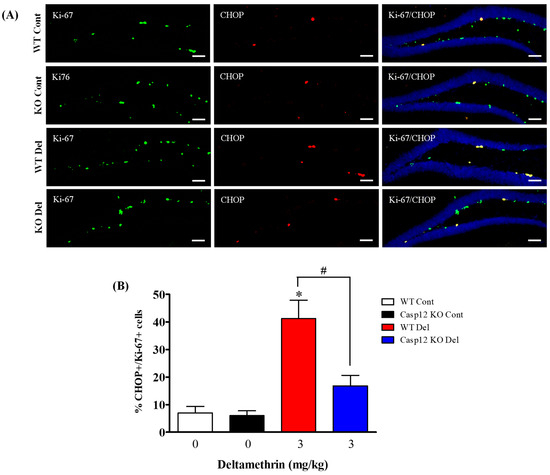 Caspase-12 KO mice exhibit attenuated the deltamethrin-induced increase in the number of CHOP and Ki-67 co-labeling cells in the DG of the hippocampi of mice. After 48 h of exposure to deltamethrin (3 mg/kg, p.o.), mice were sacrificed for histochemical assessment. (A) Representative triple immunofluorescence staining was conducted for Ki-67 (green), CHOP (red), and DAPI (blue). (B) Positive cells in the subgranular zone (SGZ) were manually counted at high magnification (40×) using an All-in-One Fluorescence Microscope (BZ-X810, Keyence Corporation, Itasca, IL, USA). The quantification of Ki-67/CHOP-positive cells (yellow) is presented in the bar graph. Representative images were uniformly adjusted for brightness and contrast using ImageJ 1.53 software to enhance the visualization of immunoreactivity. Positive cell quantification was performed on 12 sections per animal from 5 animals per group. The group mean was obtained by averaging the counts from these sections, and statistical comparisons were made using two-way ANOVA with Bonferroni’s post hoc test. An asterisk (*) indicates a significant difference from the control group, and a hashtag (#) indicates a significant difference from deltamethrin when compared with deltamethrin + caspase-12 KO group (F 3,12 = 16.01; p < 0.002). Scale bar = 800 μm.