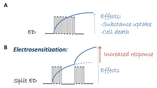 Schematic representation of electrosensitization. For a certain electric dose (ED) in terms of pulse number, amplitude, and repetition frequency that induces a specific effect (e.g., substance uptake, cell death, panel (A)), the electrosensitization effect occurs if the same ED in terms of pulse amplitude and repetition frequency, but delivered in multiple pulse fractions, is able to amplify the same effect (panel (B)).