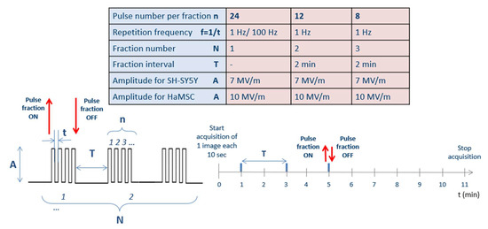 Globally, 24 pulses were delivered to cells as in [11], consecutively or arranged in multiple fractions (with 2 min of silencing between a fraction and another) for a total of four different stimulation modalities, including two different repetition frequencies (1 and 100 Hz). Figure 2 summarizes the delivered pulse protocols: there were different conditions that were explored for both cellular lines.