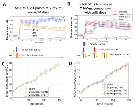 The electrosensitization of Ca2+ fluxes could be a significant endpoint as the controlled increase of Ca2+ is beneficial in regulating various cell functions, from differentiation to migration, which can be exploited in therapeutic applications. We monitored the fluorescence ratio of the emissions of FURA-2-AM excited at two different wavelengths (as detailed in Section 4) over time. The detection of electrosensitization relies on the achieved Ca2+ level, as depicted in Figure 1. If the phenomenon occurs, a higher level of Ca2+ uptake must be achieved when the electric protocol is delivered to cells in two or three fractions (Figure 1B).