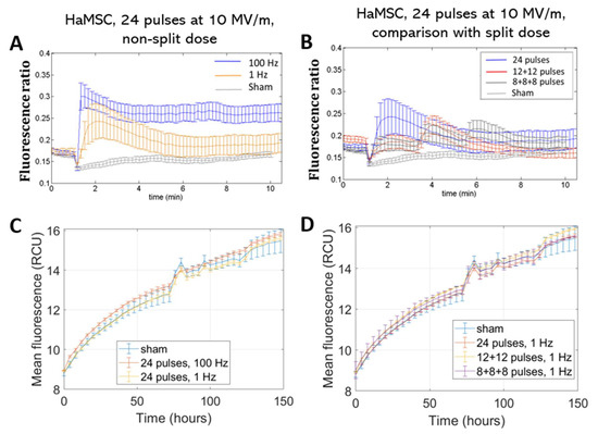 Ca2+ fluxes in HaMSC cells (A,B). Fluorescence ratio of FURA-2-AM dye measured by time-lapse before and after pulse delivery using different exposure protocols: (A) 24 pulses at 1 Hz and 100 Hz and (B) 24 pulses at 1 Hz delivered consecutively or in multiple fractions (p < 0.05 in (A) starting from 4 min). The stimulation patterns are the same as in Figure 2. Acquisition for 11 min, 1 image each 10 s. Proliferation of HaMSC cells (C,D). Mean fluorescence of NucLight red dye measured at the end of exposure with (C) 24 pulses at 1 Hz and 100 Hz and (D) 24 pulses delivered consecutively or in multiple fractions at 1 Hz. Acquisition for 150 h, 1 image each 4 h. ‘Sham’ condition indicates the absence of electromagnetic fields.