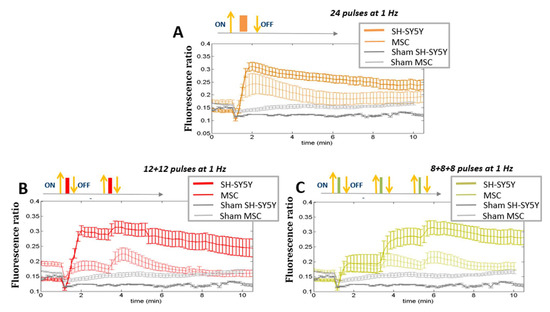 Ca2+ fluxes. Comparison among different protocols of pulses (24 pulses in one shot or in multiple fractions at 1 Hz) between SH-SY5Y (stimulated at 7 MV/m) and HaMSC cells (stimulated at 10 MV/m). ‘Sham’ indicates the absence of electromagnetic fields. (p < 0.05 starting from 1 min in panel (A,B), p < 0.05 from 3 min in panel (C)).
