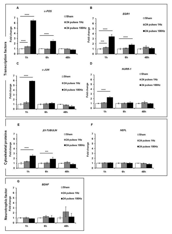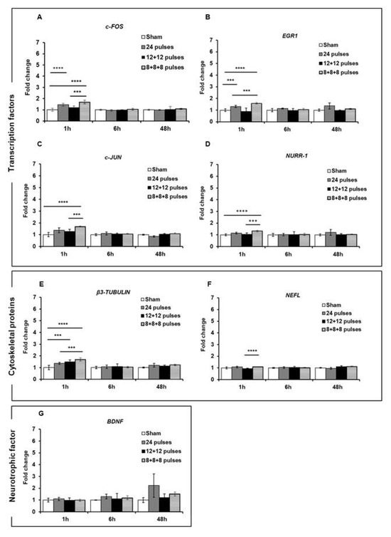 mRNA expression levels of transcription factors c-FOS (A), EGR1 (B), c-JUN (C) and NURR-1 (D); structural proteins β3-TUBULIN (E) and NEFL (F); and neurotrophic factor BDNF (G) were analyzed by qPCR after 1, 6, and 48 h of stimulation of SH-SY5Y cell line with 24 electric pulses at 1 Hz delivered consecutively or in multiple fractions. Data are reported as mean ± SD *** p < 0.001; **** p < 0.0001 for comparison with sham groups.