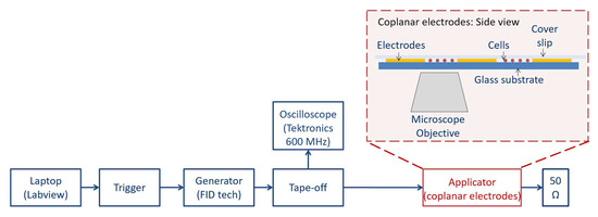 Block diagram of cell exposure system. The coplanar waveguide structure was integrated into an inverted microscope stage (Carl Zeiss, Jena, Germany). Electric pulses lasting 10 ns in different stimulation patterns were delivered by the FID high-voltage generator (FID GmbH, Burbach, Germany) triggered by the Agilent waveform generator 5386A (Agilent Technologies, Santa Clara, CA, USA) and controlled by an in-house LabVIEW 2016 program. The tape-off stage (BARTH® Elektronik GmbH, Lengerich, Germany) was necessary to send signals both to the coplanar electrodes and to an oscilloscope for monitoring (600 MHz TDS 3064B, Tektronix, Beaverton, OR, USA). An example of an acquired fluorescence image is reported in the Supplementary Materials (Figure S2).