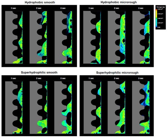 Fibrinogen dynamics visualized via color mapping. Implants with two different surface topographies and with or without superhydrophilicity are compared. The color scale applies to all panels.