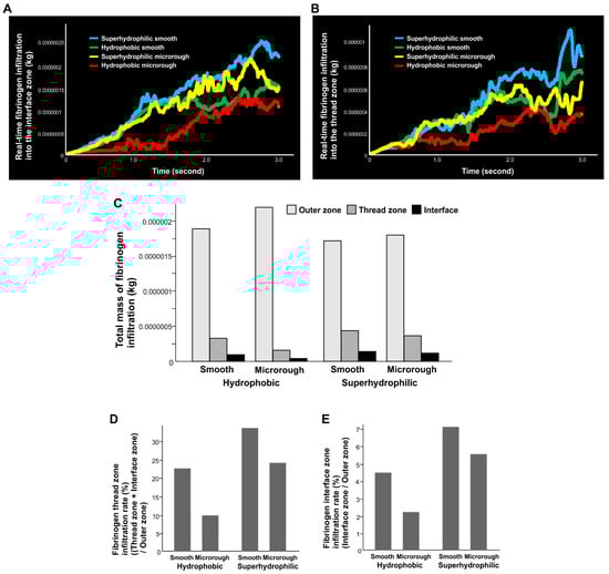 There was also greater infiltration into the thread zone of the hydrophobic smooth surface than the hydrophobic microrough surface (Figure 2B). The fibrinogen mass around the hydrophobic microrough interface was only 50% of that around the counterpart smooth implants, even after 3 s. Superhydrophilicity significantly increased fibrinogen infiltration for both surface topographies. Similar to the result of the interface zone, the most fibrinogen was around the superhydrophilic smooth surface, and the least was around the hydrophobic microrough surface.