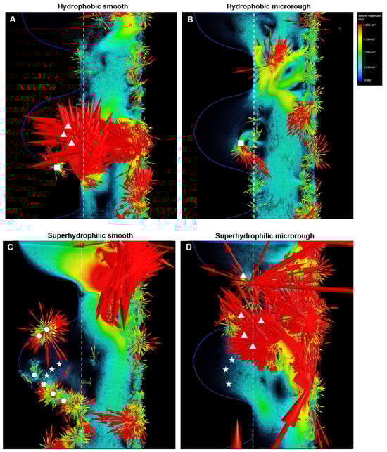 Vector color mapping for blood flow around four different surfaces (A–D). Each vector represents the direction and speed of the cell meshed in the domain. Refer to the main text for symbols. The color scale applies to all panels.