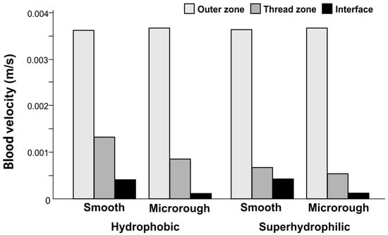 We next analyzed the average velocity of the whole blood based on the vector analysis. Velocity was highest in the outer zone for all four implant surfaces, followed by the thread and interface zones (Figure 4). Although the outer zone velocity was similar for the four surfaces, the thread and interface zone velocities were substantially different according to surface type. Thread–zone velocity was higher for smooth surfaces than microrough surfaces, and superhydrophilicity significantly reduced the velocity. The interface velocity was also higher for smooth surfaces than microrough surfaces, but the effect of superhydrophilicity/hydrophobicity was not substantial. The velocity varied drastically according to surface topography, wettability, and zones, for example: (1) the thread zone velocity for the superhydrophilic microrough surface was half that of the hydrophobic smooth surface; (2) the interface velocity was 2.7-fold slower for the superhydrophilic microrough surface than the hydrophobic smooth surface; and (3) the interface velocity was 25-fold slower than the outer zone velocity around the superhydrophilic microrough surface.