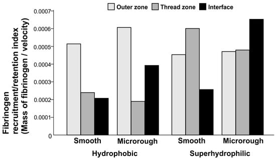 Adding superhydrophilicity to smooth surfaces significantly increased the fibrinogen recruitment/retention index in the thread zone by 2.5-fold. Likewise, superhydrophilic microrough surfaces showed a significant increase in the thread and interface zones compared with hydrophobic counterparts. The index in the interface zone of the superhydrophilic microrough surface was the highest of all the tested zones and surface types.