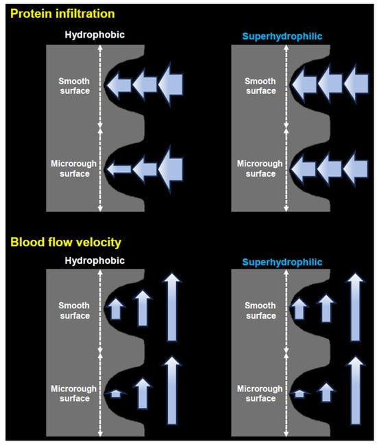 - Kitajima, H.; Hirota, M.; Osawa, K.; Iwai, T.; Saruta, J.; Mitsudo, K.; Ogawa, T. Optimization of blood and protein flow around superhydrophilic implant surfaces by promoting contact hemodynamics. J. Prosthodont. Res. 2022, 67. [Google Scholar] [CrossRef]