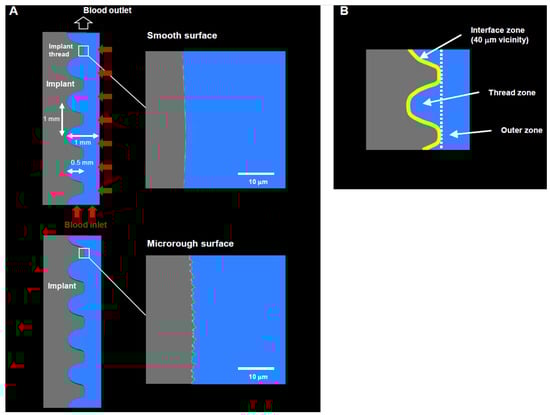 A CFD model designed for a screw-shaped implant. (A) Dimensions and design of an implant, blood area, boundary conditions, and modeling of two different surface topographies. (B) The three different zones defined around an implant.