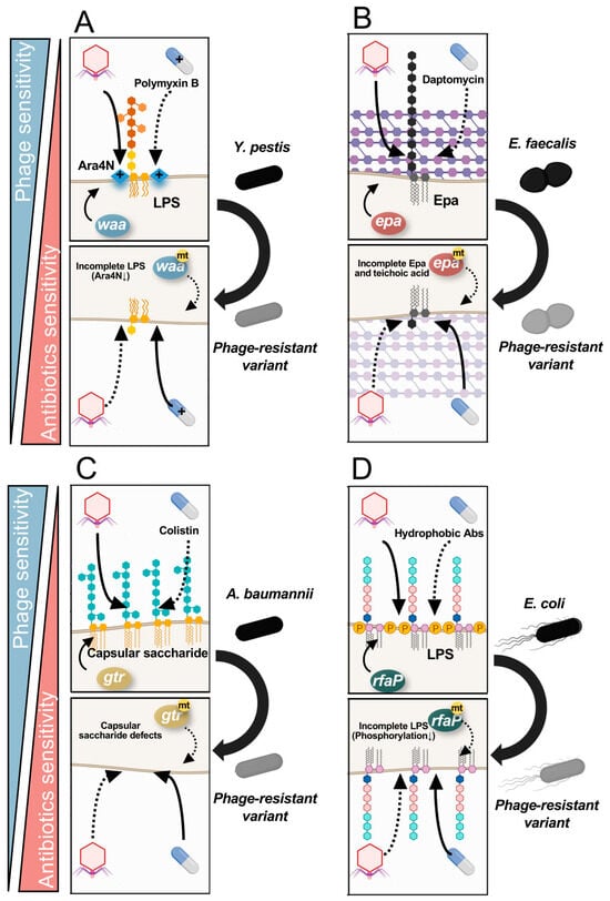 Molecular mechanisms for sensitization to antibiotics via saccharide-associated phage resistance. (A) A trade-off between polymyxin B sensitivity and phage sensitivity, which has been attributed to mutations in waa, a set of genes that regulate the length of the chain of LPS, has been reported in Y. pestis. Notably, it is estimated that an incomplete LPS core structure results in loss of phage susceptibility, and the LPS content of positively charged Ara4N is also reduced, resulting in increased susceptibility to positively charged polymyxin B. (B) A trade-off between daptomycin and phage susceptibility, which has been attributed to mutations in epa, a set of genes that biosynthesize Epa, has been reported in E. faecalis. epa has been suggested to contribute to the synthesis of teichoic acid in addition to Epa biosynthesis. The trade-off between phage resistance and daptomycin resistance is considered to be due to defects in the structure of teichoic acid and Epa. (C) A trade-off between colistin and phage susceptibility, which has been attributed to mutations in genes such as gtr and gpi, genes that are responsible for the synthesis of capsular polysaccharides, has been reported in A. baumannii. Deletion of the capsular polysaccharide causes the phage to lose its receptor, but the bacterium loses its barrier to colistin access, which is estimated to increase its susceptibility to colistin. (D) A trade-off between hydrophobic antibiotics and phage susceptibility, which has been attributed to mutations in the rfpP gene that is responsible for phosphorylation of LPS, has been reported in E. coli. rfaP mutations are considered to reduce phosphorylation and improve access and increase susceptibility to hydrophobic antibiotics. mt: mutation; Abs: antibiotics.