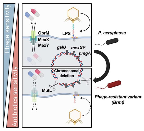 Bacteria also have DNA mismatch repair systems, and the enzyme Mut is known to play a central role in this mechanism. When Mut cleaves DNA at two or more sites, the fragments are deleted from the bacterial chromosome. It has been reported that P. aeruginosa acquires resistance to LPS-targeting phages through Mut-mediated chromosomal deletion when a gene essential for LPS core synthesis, galU, is included in the deleted region [80] (Figure 3). In addition, hmgA, which codes for an enzyme that metabolizes homogentisic acid located near galU, is also deleted at the same time during chromosome deletion. As a result, P. aeruginosa that cannot metabolize homogentisic acid exhibits brown pigmentation [80,81,82,83]. Shen et al. investigated phage resistance selection via MutL and referred to the resulting brown-pigmented phage-resistant variants as “brown mutants” (brmts) [80]. On the other hand, since the deleted regions are often large (i.e., up to several hundred kbp), it is assumed that the selection of phage-resistant variants by this mechanism will lead to a fitness trade-off in terms of antibiotic susceptibility if the large deleted chromosomal sequences encode genes related to antibiotic resistance. This idea was popularized after a report by Nakamura et al. who used LPS-targeting P. aeruginosa virus ΦS12-3 [84]. They focused on examining what other kinds of antibiotic-resistant genes exist in the large deleted chromosomal regions that confer phage sensitivity in a galU-dependent manner, and referred to these fluctuating sequences as the Bacteriophage-induced galU Deficiency (BigD) region. Eventually, they found that the genes encoding multidrug efflux pumps, mexX and mexY, are located between galU and hmgA in the BigD region of a phage-resistant variant of a P. aeruginosa veterinary isolate. Thus, phage-resistant variants that exhibit brown pigmentation are likely to lack MexXY, and they suggest that this feature is clinically useful as a marker as it can be used to effectively predict the likelihood of a fitness trade-off. They also reported increased sensitivity to enrofloxacin and orbifloxacin, which are known substrates of MexXY, in brmts obtained by co-culture with ΦS12-3. It has been demonstrated that even when the drug efflux pump is not the direct receptor of phages, it is possible to attenuate the function of the drug efflux pumps using an indirect molecular mechanism such as BigD (Figure 3). The results also suggest that more widely used LPS-targeting phages, compared to drug efflux pump-targeting phages, can also be used to indirectly induce a fitness trade-off via drug efflux pump function.