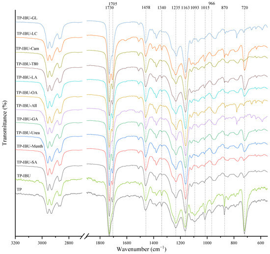 Interactions between the adhesive matrix and the introduced active substances were examined using infrared spectroscopy (FTIR). Figure 1 shows the FTIR spectra of patch samples containing ibuprofen and various permeation promoters. All spectra show peaks corresponding to the characteristics of the acrylate adhesive matrix, i.e., strong vibrations are present at 1730 cm−1 contributed by -C=O of acrylate groups, and peaks that simultaneously occur in the adhesive matrix and the structure of ibuprofen, i.e., corresponding to the hydroxyl groups and hydrogen bonds in the range of 3000–2800 cm−1, and corresponding to the bonds stretching vibrations between C-O atom characteristics for ether (Ar-OR), ester (RCOOR’), and carboxylic acid (RCO-OH) groups, visible as bands at wavenumber 1235, 1163, 1093, 1015, and 966 cm− 1, while bands at wavenumber 1458 cm−1 correspond to the C-C bonds in the aromatic ring. The mentioned peaks are observed for all tested patches, and no shifts or significant changes in intensity or shape are observed in this case. On the other hand, the presence of a distinct peak at 1705 cm−1, corresponding to the bonds stretching vibrations between C=O atoms characteristic for carboxylic groups (RCO-OH), is characteristic for all patches containing ibuprofen in comparison to the patch without ibuprofen (TP). It was also observed that the addition of various penetration promoters affects the intensity of the bands at 1340, 1015, 870, and 720 cm−1 corresponding to ether, ester, or carboxyl groups, which is related to the presence of these characteristic groups in the structures of the additives used. Additionally, Figure S1 shows FT-IR spectra of the pure form of the permeation promoters.