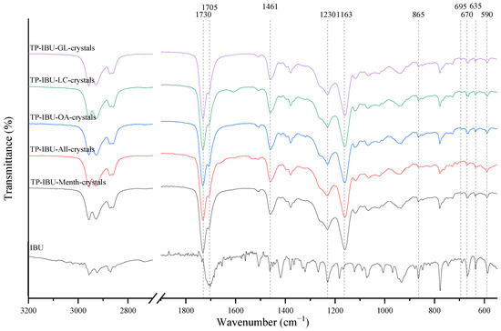 The IR method equipped with a microscope was particularly helpful in identifying the crystallised substance in patches stored without the protection of the adhesive layer. This method allows for viewing the transdermal patch’s specified measurement site and simultaneously collecting the infrared spectrum. The FTIR spectra of patch samples containing ibuprofen and various permeation promoters made in the areas of crystallisation are presented in Figure 2, along with the reference sample, which was ibuprofen. Samples were also analysed for the presence of various permeation promoters (spectra of the pure form of the permeation promoters used are provided in Supplementary Materials Figure S1). The spectra of the crystallised substance are almost identical, which indicates that it is probably ibuprofen. This may be confirmed by the presence of peaks characteristic of ibuprofen at 1705 cm−1, corresponding to the bonds stretching vibrations between C=O atoms characteristic for carboxylic groups (RCO-OH), or characteristic of ibuprofen peaks at 695, 670, 635, and 590 cm−1. Moreover, shifts of peaks 1458, 1235, and 870 cm−1 to 1461, 1230, and 865 cm−1, respectively, were observed, which exactly occur in these places in the pure form of ibuprofen. The presence of additional peaks, e.g., at 1730 cm−1 and 1163 cm−1, which are not present in the IBU spectrum, indicates that information has also been collected regarding the adhesive matrix surrounding the crystallised substance.