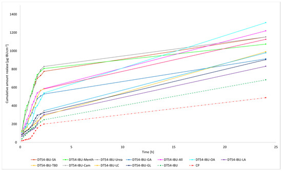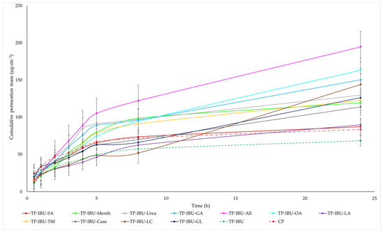 The cumulative mass of ibuprofen in the acceptor fluid at all time points is depicted in Figure 3 and Table S1. In contrast, the IBU content in the acceptor fluid collected during the 24-h permeation is summarised in Table 6. After 24 h of permeation, the cumulative mass of IBU followed this order: TP-IBU-OA > TP-IBU-All > TP-IBU-GA > TP-IBU-LC > TP-IBU-Urea > TP-IBU-GL > TP-IBU-T80 > TP-IBU-Menth > TP-IBU-Cam > TP-IBU-LA > TP-IBU-SA > CP > TP-IBU. Among the tested patches, TP-IBU-OA exhibited the highest penetration of ibuprofen, with a cumulative permeation of 163.306 ± 24.418 µg/cm2 (Table 6 and Figure 3).