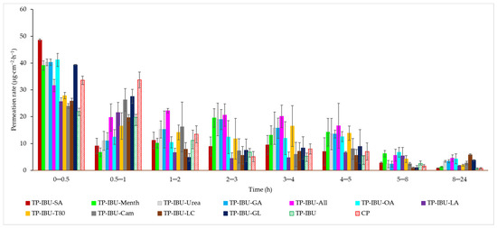 The permeation rate of IBU during the 24-h permeation; α = 0.05 (Mean ± SD, n = 3).