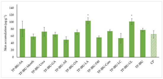 Accumulation in the skin of IBU after the 24-h penetration. Each point represents the mean ± SD (n = 3), α = 0.05, *—significantly higher accumulation in the skin versus the control (TP-IBU). The statistically significant difference was estimated using the ANOVA test (Tukey’s test).