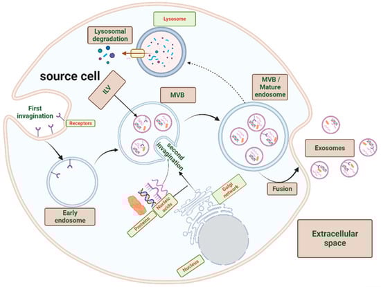 Exosomes are vesicles of endosomal origin. The early endosome is formed by an initial invagination of the cell plasma membrane into the cytosol [17]. The intraluminal vesicles (ILV) are formed by a second invagination of this early endosome membrane, and when these compartments are released into the extracellular space, they are designated as exosomes. A multivesicular body (MVB) harbors the ILVs and is referred to as a mature endosome [18,19]. Following cargo installation within the MVB ILVs, the MVB undergoes one of two potential fates: either fusion with the plasma membrane and exocytosis of exosomes or lysosomal fusion and degradation (Figure 1) [20].