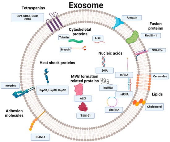 Exosomes content. Exosomes contain tetraspanins such as CD9, CD63, CD81, and CD82. Other exosomal proteins are flotillin and annexin Rab GTPases and SNARE fusion proteins, as well as heat shock proteins (Hsp) such as Hsp60, Hsp80, and Hsp90. Exosomes also harbor multivesicular bodies and MVB-formation-related proteins such as TSG101 and ALIX. Exosomes are also loaded with other types of proteins, some of which are involved in cytoskeleton formation, such as actin, tubulin, and myosin, and some adhesion molecules, such as ICAM-1 and integrins. Exosomes also carry some lipids, including cholesterol and ceramides. Exosomes conserve a diverse profile of nucleic acids, including DNA, messenger RNA (mRNA), microRNA (miRNA), long non-coding RNAs (lncRNA), and circular RNAs (circRNAs). The figure was created with BioRender.