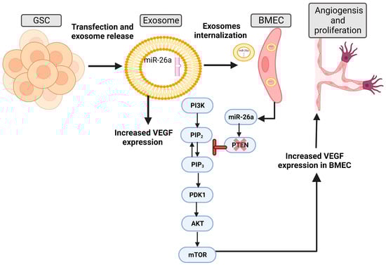 Glioma stem cells (GSCs) enhance the aggressiveness of GBM and promote angiogenesis [84,85]. Several studies probed the role of GSC-derived exosomes in the development of angiogenesis in HBMEC, particularly focusing on the effect of their miRNA cargo [13,68]. Improved VEGF expression in GSC exosomes transfected with miR-21 or miR-26a led to further VEGF upregulation in HBMEC after uptake. This also increased HBMEC’s angiogenic capacity, which had been significantly reduced following VEGF knockdown. The data suggest that the angiogenic capacity of HBMECs was augmented via the miR-21/VEGF signal, with the downstream effect being attributed to the activation of VEGF receptor type 2 in HBMECs [13]. While miR-26a targets the tumor suppressor PTEN and reduces its expression, the outcome of this regulation is the activation of the PI3K/Akt signaling pathway to stimulate the angiogenesis and proliferation of HBMEC [68] (Figure 3).