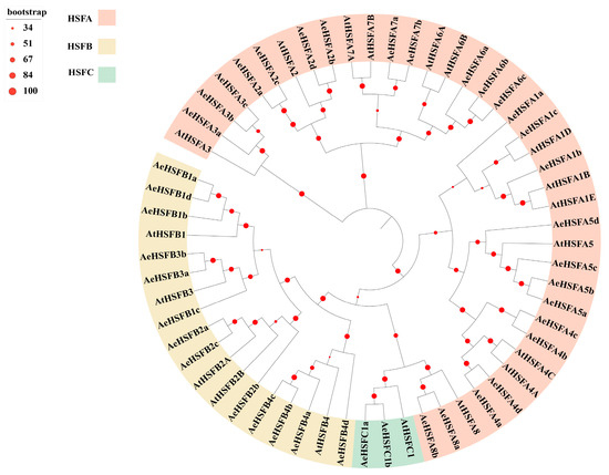 Phylogenetic analysis of A. eriantha (AeHSFs) and A. thaliana (AtHSFs) proteins. The tree was constructed using MEGA 6.0 by the neighbor-joining method with 1000 bootstrap replicates. The number on the branch denotes the reliability of the node based on 1000 bootstrap verification; Different colors of the inner ring indicate different classification results for HSFs.
