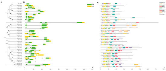 To further investigate the evolutionary relationships of AeHSFs, a total of 61 HSF protein sequences from Arabidopsis and kiwifruit were utilized to construct a phylogenetic tree. The 41 AeHSFs were categorized into three primary groups, namely, HSFA, HSFB, and HSFC (Figure 1). AeHSFA was the largest group with 26 members, which represented 63.4% of the total AeHSFs. The subsequent group was AeHSFB with 13 members, which accounted for 21.3% of the total AeHSFs. The smallest group was AeHSFC with only 2 members, which constituted only 4.8% of the total AeHSFs. In addition, the HSFA category is further divided into HSFA1-8 subgroups. The HSFB category is further divided into HSFB1-4 subgroups. The HSFC category is further divided into only one subgroup (Table 1).