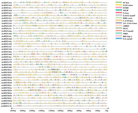 Predicted cis–elements in the promoter upstream 2000 bp sequences of AeHSF genes, which are presented as colored rectangles.