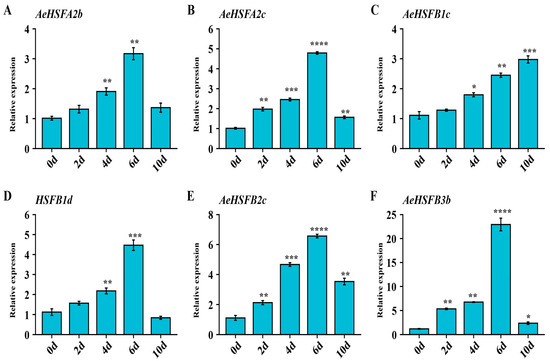 To further validate the expression pattern of key AeHSF genes under salt stress, AeHSFA2b/2c and AeHSFB1c/1d/2c/3b genes were selected for qRT-PCR analysis. As shown in Figure 6, the expression levels of AeHSFA2b/2c and AeHSFB1d/2c/3b were significantly induced and peaked at 6 d under salt treatment. The expression levels of AeHSFB1c increased gradually during the whole salt-treated time. These results indicate that these genes were really induced by salt stress.