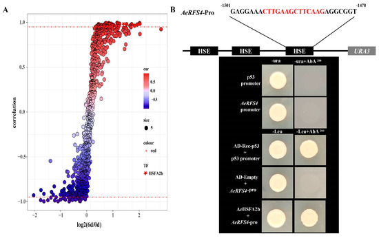 AeHSFA2b transcription factor in the modulation of AeRFS4. (A) Correlation analysis of all transcription factors with the expressional pattern of AeRFS4 based on the RNA−seq results. The x axis indicates log2 (FPKM ratio of salt 6 d: CK 0 d). The y axis indicates the values of correlation between RFS4 and each transcription factor. Pentangles show the AeHSFA2b that were highly correlated (R ≥ 0.95, red dashed lines) with the expression patterns of RFS4. (B) Interaction of AeHSFA2b with the promoter of RFS4 in the Y1H assay.