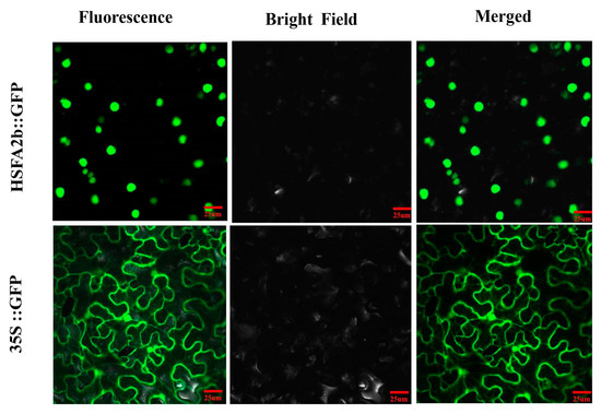 Subcellular localization of AeHSFA2b and empty vector in Nicotiana benthamiana leaves after 2 days of infiltration. The green fluorescence of GFP is indicated. White arrows indicate the GFP signal from the nucleus. Scale bars = 25 μm.