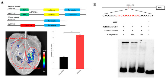 The direct targeting and transcriptional modulation of the RFS4 promoter by AeHSFA2b. (A) A dual−luciferase (LUC) assay in Nicotiana benthamiana leaves was performed to explore the transcriptional activation function of RFS4 on AeHSFA2b promoters. The control group for the experiment involved the use of an empty vector. Representative images were captured to visually represent the outcomes, and the activity of LUC/Renilla luciferase (REN) was quantified to validate the transcriptional activation of RFS by AeHSFA2b. The error bars in the graph indicate the standard deviation (SD). Statistical analysis was conducted using the Student’s t-test. Significance at p < 0.01 is denoted by **. (B) The AeHSFA2b protein exhibited binding affinity towards specific regions of the AeRFS4 promoter by using an electrophoretic mobility shift assay (EMSA).