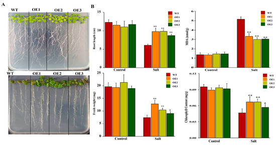 To identify functional characterization of AeHSFA2b under salt stress, three lines of transgenic Arabidopsis (designated as OE1, OE2, and OE3) were generated in this study. Under normal conditions (referred to as control), transgenic plants displayed robust growth without any noticeable differences. Compared to the wild-type, the transgenic plants of OE lines had significantly larger and heavier leaves after salt treatment (Figure 10A). The growth parameters (root length, plant fresh weight, and chlorophyll) of overexpressing the AeHSFA2b gene at seedlings were significantly higher than WT plants. The MDA contents of overexpressing the AeHSFA2b gene at seedlings were significantly lower than WT plants. These results indicate that AeHSFA2b overexpression indeed increased the tolerance to salt stress.