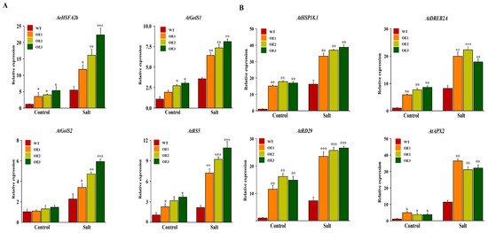 Under salt stress, the expression of AeHSFA2b, AtGolS1/2, AtRS5, and salt-responsive marker genes expression of AtHSP18.1, AtEGY3, AtRD29, and AtAPX2, which is homologous to AeRFS4, in transgenic Arabidopsis lines exhibited a significant increase compared to the wild-type (Figure 11A,B), indicating that the AeHSFA2b transgenic Arabidopsis plants potentially improved salt tolerance possibly by promoting the accumulation of raffinose or other salt-responsive marker genes.