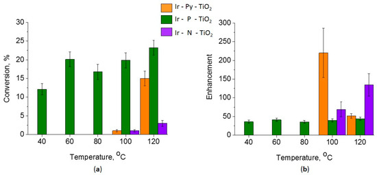 In contrast, for Ir-Py-TiO2 and Ir-N-TiO2 catalysts, both activity and enhancement are found only at 100 °C and 120 °C. The significant increase in the conversion up to 15% for the Ir-Py-TiO2 sample points to the formation of metal particles above 100 °C, which explains the drop in enhancement from 220 at 100 °C to 51 at 120 °C due to Ir complex decomposition. Note that the signal enhancement for the Ir-Py-TiO2 catalyst is comparable to that of the Ir-NH2-Linker-SiO2 catalyst [4], while the latter is more stable and non-reduced at 120 °C. For the Ir-N-TiO2 sample, an analysis of the catalytic tests shows a slight increase in activity along with a pronounced increase in enhancement from 69 at 100 °C to 134 at 120 °C, which implies that the immobilized complex is stable in this temperature range.