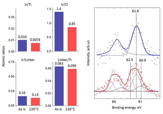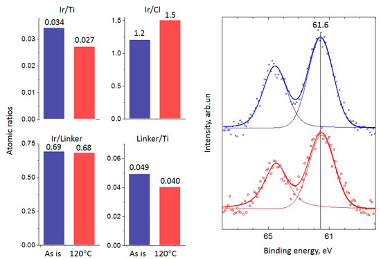 The ratio of Ir/Cl (total Ir) can be considered an indicator of the undamaged state of immobilized [Ir(COD)Cl]2 at the surface of the silica support modified with the linkers [2,26]. Then, the increase in the Ir/Cl ratio after the reaction indicates the decomposition of the complex. In the case of the SiO2 support, this assumption works precisely, but for titania, some Cl− ions are able to bind with the support [28,29]. Since Cl 2p binding energy values for this state and for the immobilized [Ir(COD)Cl]2 complex are reported to be within the same range of 198.0–198.3 eV, the amount of Cl cannot serve as a strict criterion for complex stability or decomposition over the surface of the TiO2 support.