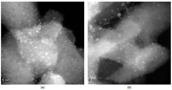 For the Ir-N-TiO2 sample, the ‘Linker/Ti’ ratio is rather stable, while that of ‘Ir/Linker’ slightly decreases because of the drop in Ir content (Figure 6). Compared with Py and P linkers, the N linker is the most stable under propene hydrogenation conditions. Regardless of linker stability at the surface of TiO2, the drop in the Ir/Ti ratio can be explained by the partial decomposition of the immobilized [Ir(COD)Cl]2 complex. In Figure 6, the Ir 4f line for the Ir-N-TiO2 sample is shown. For the ‘as is’ sample, a single state with a Ir 4f7/2 binding energy of 61.6 eV is found. Despite the low intensity of the Ir 4f line, after the reaction it is clearly seen that the shape of the line changes (the line width doubles) and its intensity decreases. The deconvolution of the spectrum after the reaction reveals three co-existing states: a state with a binding energy of Ir 4f7/2 of 60.9 eV attributed to Ir(0) [23,25,27], of 61.6 eV attributed to Ir(I) (complex) and of 62.5 eV attributed to Ir(III) (oxidized highly dispersed iridium). If the drop in the Ir content was caused by the removal of the complex, only Ir(I) would be seen in the XPS spectrum. The observation of the metal state of Ir indicates the partial decomposition of the complex followed by the migration and aggregation of the obtained individual Ir atoms to yield metal particles that are more stable than individual atoms against oxidation in air during transfer to the XPS spectrometer [32]. The increase in the enhancement of the NMR signal from 69 to 134, found for this sample to be in the range of 100–120 °C, can be explained by the stability of the immobilized [Ir(COD)Cl]2 complex linked to the surface of TiO2 by the N linker. At the same time, the increase in propene conversion in the same temperature range is the result of partial complex decomposition and iridium metal sintering. The total increase of the conversion at 120 °C up to 3% is rather small, an can be considered the result of the sintering of Ir and a drop in the Ir content available for the reaction. TEM data (see Figure 7) show the presence of both individual nanoparticles of Ir (a rounded bright object with size of ~1.2 nm in the middle-right of the image) and bright spots of atomic size. More HR TEM images are presented in Figure S4. It should be mentioned that no clusters similar to those in the Ir-P-TiO2 sample (Figure 4) are seen, which is in agreement with the differences in the catalytic behavior of these samples (Figure 1).