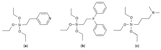Chemical structures of the linkers: (a) 2-(4-pyridylethyl)triethoxysilane; (b) 2-(diphenylphosphino)ethyltriethoxysilane; (c) (3-N,N-dimethylaminopropyl)triethoxysilane.
