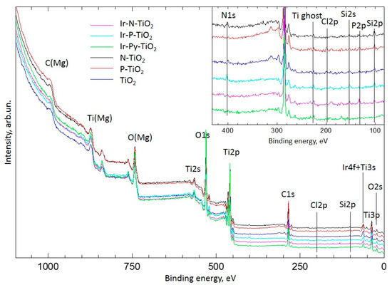 The XPS study was carried out on a PHOIBOS-150/MCD-9 photoelectron spectrometer (SPECS Surface Nano Analysis GmbH), with non-monochromatized MgKα radiation and a power of 200 W. Before measurements, the energy scale of the spectrometer was calibrated to the positions of Au4f7/2 (84.0 eV) and Cu2p3/2 (932.7 eV) lines. The residual gas pressure in the analyzer chamber did not exceed 3 × 10−7 Pa during spectrum acquisition. The samples were fixed on the standard holder by pressing them into 3MΤΜ conductive Cu adhesive tape without further grinding. The Binding energy values and the areas of peaks for each XPS region were determined after the subtraction of the Shirley background and the analysis of line shapes. Curves were fitted with Gaussian–Lorentzian functions. For quantitative analysis, the atomic ratios calculated as the ratios of intensities of the main lines of elements to the elemental sensitivity factors with regard to the transmission function of the analyzer [23] were used. The spectra were processed using XPSPeak 4.1 software. High-resolution spectra are shown in Figures S5–S10. The errors are ~2% for the atomic ratios and 0.1 eV for the binding energy positions of the peaks. For all studied samples, the binding energy of Ti2p3/2 was 458.8 eV [23]. According to XPS, original titania contains traces of N, P and Si (Figure 9). These were taken into account in the quantitative analysis of the prepared samples of the immobilized Ir catalysts. The regions of Ti3s and Ir4f lines overlap, and these were taken into account for the decomposition of the spectra of catalysts based on the analysis of the Ti2p and Ti3s regions recorded for clean TiO2 and modified supports.