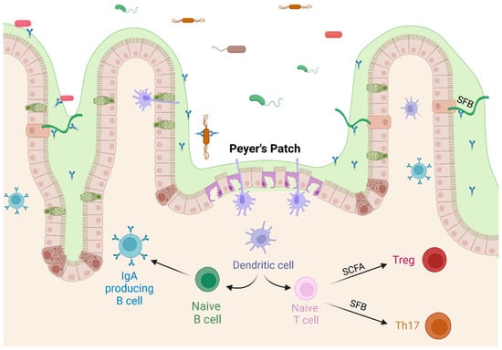The adaptive immune system is also very active within the GIT. Antigens in the lumen are constantly sampled, especially in the specialized areas of the Peyer’s Patches, which are located along the small intestine, most densely in the ileum. The development of Peyer’s Patches is reduced in germ-free mice [62]. They are areas with a thinner mucus coating, no villi, and specialized M-cells that allow dendrites to extend into the lumen and sample antigens, including food, viruses, and bacteria. Located below the Peyer’s Patch is an area of lymph tissue where antigen-presenting cells can interact with naïve B-cells, triggering the subsequent production of sIgA in the lamina propria [63]. Sampling through the Peyer’s Patch is a source of undiversified IgA in the intestine [64], although luminal sampling near goblet cells has also been observed [65,66]. The differentiation of T-cells is also directly affected by the microbiome. CD4+ naïve T-cells differentiate into regulatory T-cells (Treg) or Th17 cells in the presence of TGF-β, with Th17 cells requiring the additional presence of IL-6. Beneficial commensal bacteria lower the production of IL-6, promoting the differentiation into Treg cells, which produce IL-10 and reduce inflammation levels [67,68]. Antigen sampling within the gut is likely to stimulate immunotolerance because of regulatory cytokine ratios present in the healthy intestine. This propensity for tolerance is extended to other areas of the body, as the immune cells trained in the GIT migrate to other parts of the body [69]. Peyer’s Patches are also the most prominent areas for T-cell dependent class switching, while T-cell independent class switching takes place within the laminal propria [17,63]. Immune training through luminal sampling in the GIT trains the adaptive immune system and affects the systemic immune response.