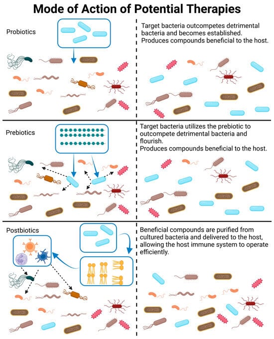 A visual representation and description of how probiotics, prebiotics, and postbiotics modify the gut microbiome. Please note that probiotics may be a combination of bacterial species, which is not depicted in this figure. Likewise, postbiotics may be a combination of bacterial products or whole killed bacteria delivered to the GIT. Created with BioRender.com (accessed on 23 October 2023).