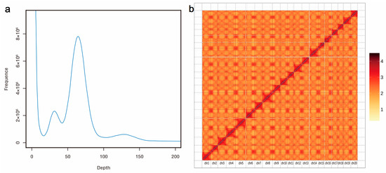 The 17-mer frequency distribution and Hi-C heatmap of P. fortunei genomes: (a) 17-mer frequency distribution of the genome, the X-axis is the K-mer depth, and the Y-axis represents the frequency of the K-mer for a given depth; (b) The Hi-C heatmap of the genome. A total of 20 chromosomes were numbered from asm_0 to asm_19.