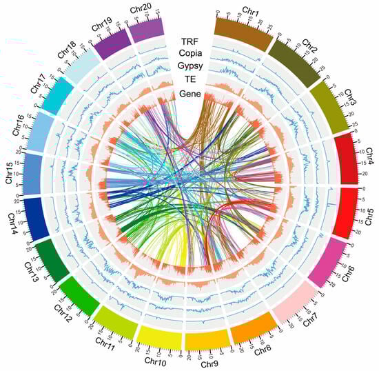 A total of 47.73 Gb (90.33× coverage) of Illumina short cleaned reads were generated for K-mer analysis and base correction; 233 Gb (440.95× coverage) of long sequencing reads were finally obtained from the PacBio platform, and 116 Gb of high-throughput chromosome conformation capture (Hi-C) sequence data (219.53× coverage) were ultimately obtained. The genome size of P. fortunei was estimated to be 528.41 Mb with 0.52% heterozygosity and a repeat sequence ratio of 50.98% (Figure 1a). By combining short cleaned reads, long sequencing reads, and Hi-C sequence data, a draft genome of P. fortunei with a total length of 476.82 Mb, a contig N50 length of 7.81 Mb, and a scaffold N50 length of 21.81 Mb was constructed. As a diploid species (2n = 40) [7], 20 pseudochromosomes with a total length of 437.72 Mb (accounting for 91.80% of the entire genome) were finally obtained (Table 1 and Figure 1b). A map connecting homologous regions of the P. fortunei genome is shown in Figure 2. The benchmarking universal single-copy orthologs (BUSCO) assessment indicated that 93.50% of the complete BUSCO genes (1440) were identified. By contrast, 240 (96.77%) of 248 core evolutionarily conserved genes were detected and assembled in the genome using the core eukaryotic genes mapping approach (CEGMA), confirming the high completeness of the genome assembly. The BWA evaluation indicated that 95.25% of the reads were aligned to the genome, and the coverage rate was about 97.56%.