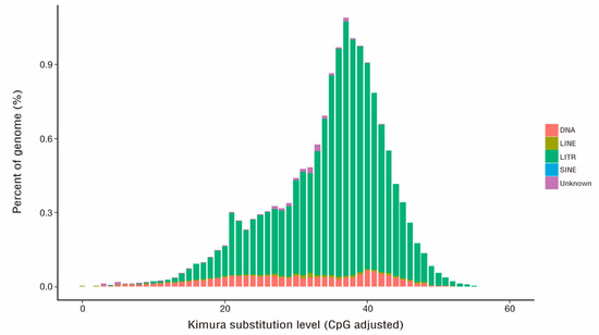 Distribution of the divergence rate of each type of repetitive element in the P. fortunei genome. The divergence rate was calculated between the identified TE elements in the genome using the homology-based method and the consensus sequence in the Repbase.