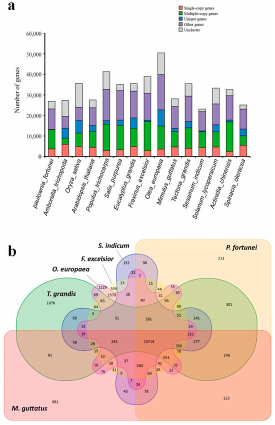 Gene family clustering of P. fortunei with other plants: (a) the distribution of genes (single-copy genes, multiple-copy genes, unique, other, and uncluster genes number) in 15 different species; (b) common and unique gene families between Paulownia fortunei, Mimulus guttatus, Tectona grandis, Sesamum indicum, Olea europaea, and Fraxinus excelsior.