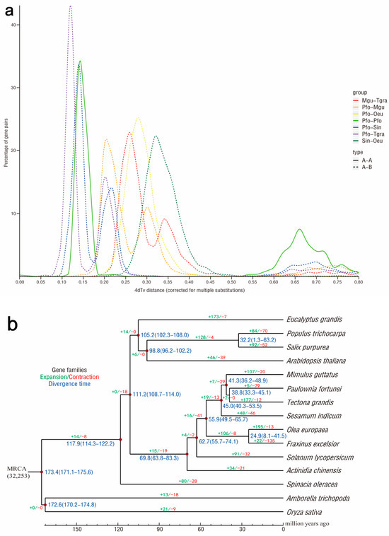 A total of 32,270 gene families were found in the 15 species through comparative genomic analysis, among which there were 7040 common gene families and 514 common single-copy gene families, respectively (Figure 4a). Comparison with Mimulus guttatus and four other species indicated that 286 genes (213 gene families) were specific to the P. fortunei genome (Figure 4b). These unique genes of P. fortunei were annotated to biological processes such as the abscisic acid-activated signaling pathway, response to hormone, and defense responses, as well as molecular functions such as abscisic acid binding, protein phosphatase inhibitor activity, and protein serine/threonine kinase activity. The syntenic regions (at least five collinear homologous genes) across P. fortunei, Olea europaea, M. guttatus, Tectona grandis, and Sesamum indicum were used to investigate the P. fortunei whole-genome duplication (WGD) (Figure 5a). Based on the transversion substitutions at fourfold degenerated sites of collinear gene pairs, except for a core eudicot common hexaploidy event that occurred 115–130 million years ago, another WGD event that may have contributed to the divergence of P. fortunei and T. grandis was identified.
