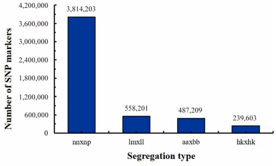 The separation types were determined according to the genotype of the hybrid parents; then, the hybrid F1 progenies were genotyped. A total of 5,099,216 polymorphic loci were found, among which 4,612,007 were segregation types nn × np, lm × ll, and hk × hk, accounting for 90.45% of the total. Thus, the three marker segregation types of nn × np (3,814,203), lm × ll (558,201), and hk × hk (239,603) were used on the genotype of the F1 population to construct genetic maps (Figure 6).