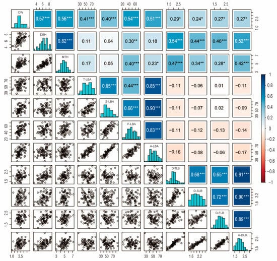 The results of statistical analysis showed that the coefficients of variation in phenotypic traits ranged from 15.03% to 24.57% (Table 4), and the individual variation was large, showing obvious separation. Among them, the traits with the largest and smallest coefficients of variation were the first lateral branch angle (F-LBA) and main trunk height (MTH), respectively. The results also showed that most of the 11 phenotypic traits had normal distributions, indicating that most were quantitative traits whose inheritance was jointly controlled by multiple mini-effect genes (Table 4, Figure 8). The high, significant positive correlations were observed between the diameter at breast height (DBH) and MTH (0.82), between the average lateral branch angle (A-LBA) and F-LBA (0.83), the second lateral branch angle (S-LBA) (0.90), the third lateral branch angle (T-LBA) (0.85), between the average diameter of the lateral branch (A-DLB) and diameter of the first lateral branch (D-FLB) (0.89), the diameter of the second lateral branch (D-SLB) (0.90), and the diameter of the third lateral branch (D-TLB) (0.91). There were moderate significant positive correlations between D-FLB, D-SLB, and D-TLB (0.65–0.72), similar to those between F-LBA, S-LBA, and T-LBA (0.44–0.66). The DBH, MTH, F-LBA, S-LBA, T-LBA, and A-LBA showed moderate significant positive correlations with crown width (CW) (0.40–0.57). The D-FLB, D-SLB, D-TLB, and A-DLB also showed moderate significant positive correlations with DBH (0.44–0.54) (Figure 8).