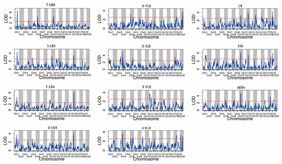 The 11 phenotypic traits related to QTL mapping among all linkage groups content: the red dashed lines represent LOD = 2.5.