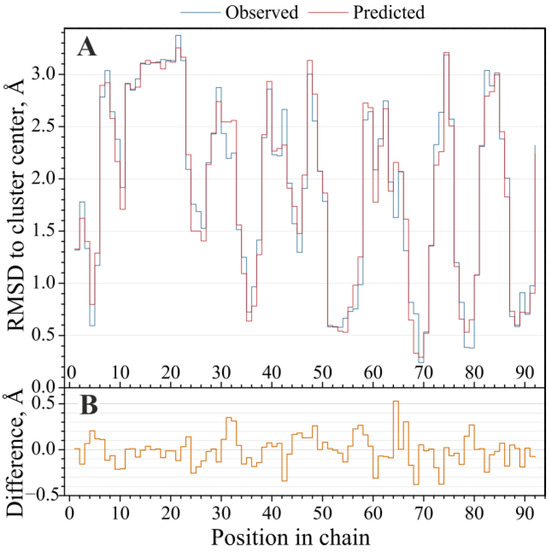 The observed and predicted RMSDs to the cluster center PB (‘d’). (A) The observed and predicted RMSD profiles from the five-residue fragments of the 1 gmp chain ‘B’ to the protein block (‘d’) cluster center. The observed and predicted distances are displayed for the central residue of a five-residue fragment. The Pearson correlation between the predicted and observed profiles is 0.95. (B) The difference between the observed and predicted RMSDs.
